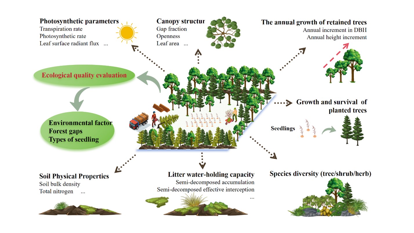随着全球气候变化与森林资源过度利用带来的生态退化问题日益严峻,温带次生林的结构简化与生态功能弱化问题亟待解决。林窗作为森林更新和群落演替的重要生态单元,对光照、水分、养分等关键因子的分布具有显著调节作用,是实现次生林恢复与提升生态质量的关键路径之一。该研究基于大兴安岭3种典型次生林中长期设立的10种类型林窗样地,系统评估了土壤、枯落物、冠层结构、生物多样性以及苗木生长存活等多个生态维度的表现。