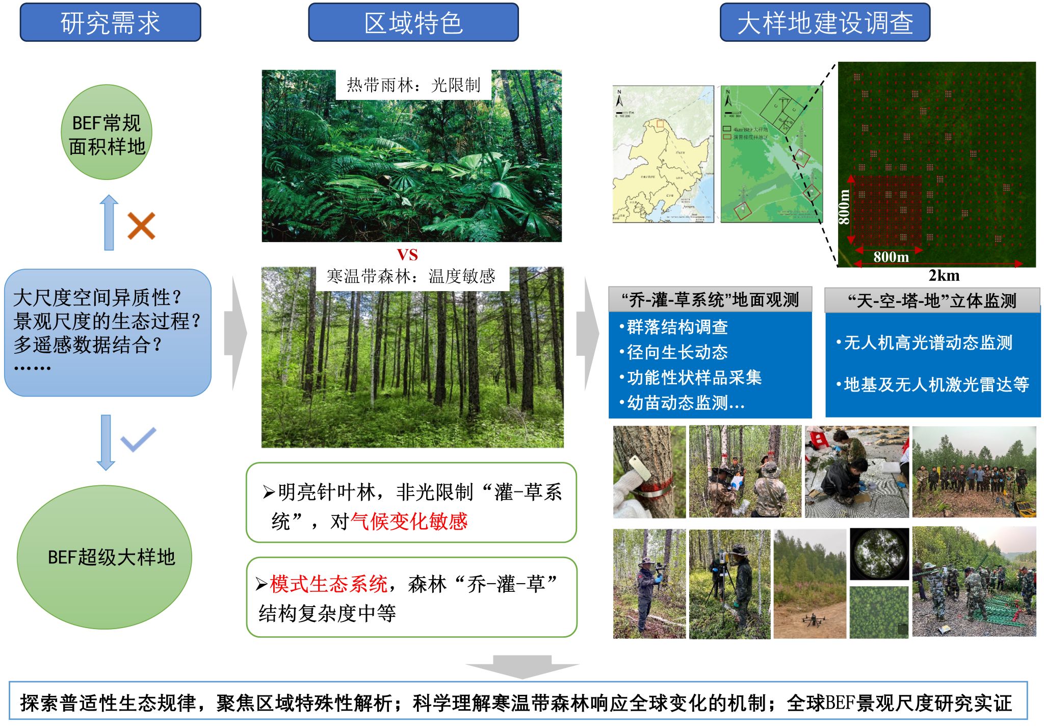 森林生物多样性与生态系统功能(BEF)研究是生态学领域的核心命题之一,重点揭示物种多样性对生产力、碳汇等生态系统功能的作用机制。自20世纪70年代以来,全球BEF研究网络不断扩大,中国科研团队通过建设覆盖主要林区的标准化样地网络,系统探究了物种丧失对生态系统功能的影响,为该领域做出重要贡献。当前国际BEF样地面积多在5-25公顷,少数达到50公顷,这类样地可有效监测群落水平的物种组成与动态,为相关研究建立了很好的研究范式。然而,随着研究深入,传统BEF样地在空间尺度上逐渐显现局限。同时,如何实现BEF研究与多源遥感数据融合已成为当前的巨大挑战和机遇。适当扩展BEF样地面积以匹配“空-天-地”不同尺度的遥感观测数据成为推进该领域研究的关键路径。