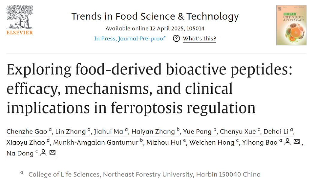 近日,我校生命科学学院高辰哲副教授在食品源生物活性肽(BAPs)调控铁死亡机制及其临床转化研究领域取得重要突破,研究成果以《探索食物源性生物活性肽:在铁死亡调控中的功效、机制与临床意义》为题发表于国际权威期刊《食品科技趋势》(Trends in Food Science & Technology)(中科院一区,影响因子15.1)。