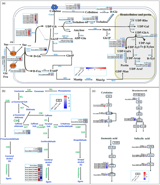 该研究通过创制杨树突变体和过量表达材料并结合木材显微结构分析表明,VINVs参与了次生木质部的发育;表现为突变体木质部宽度和细胞层数均显著减少,间苯三酚-HCl染色结显示突变体自第4 IN起染色强度低于野生型;对木材组分测定结果表明,半纤维素含量增加,木质素含量减少,纤维素含量则保持稳定。转录组测定及分析后发现,PtrVINV2表达的改变引起了半纤维素和木质素合成相关基因表达的变化。同时还发现细胞分裂素、油菜素内酯、茉莉酸和水杨酸信号转导途径的基因显著富集,表明PtrVINV2可能通过激素信号调控次生木质部的发育。对突变体进行盐敏感性测试发现,与野生型相比,突变体出现叶绿素含量降低、萎蔫、生长受到抑制等现象。进一步分析显示,PtrVINV基因的敲除导致渗透调节能力下降,抗氧化能力减弱,细胞损伤加剧,进而表现出较强的盐敏感性。